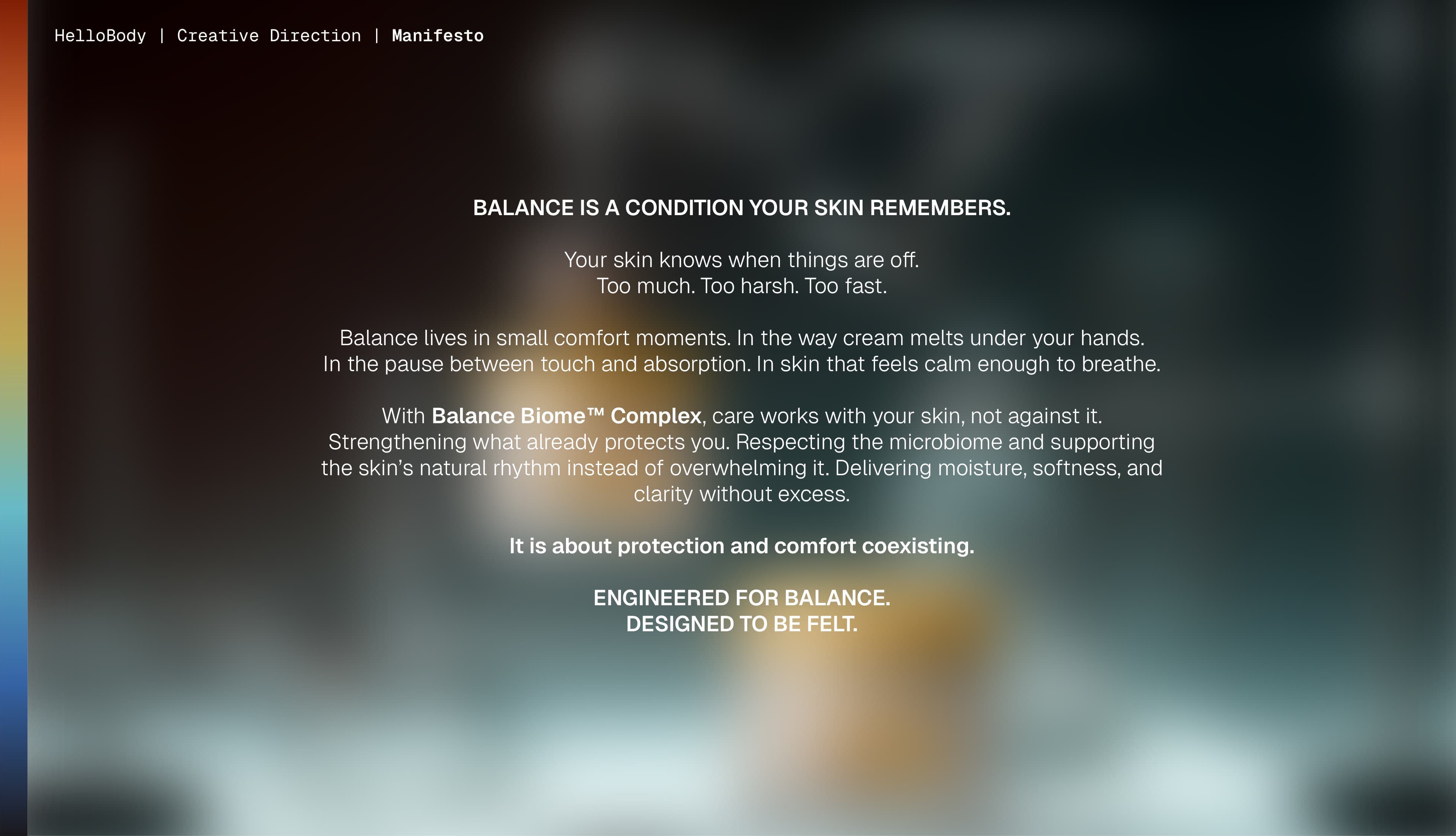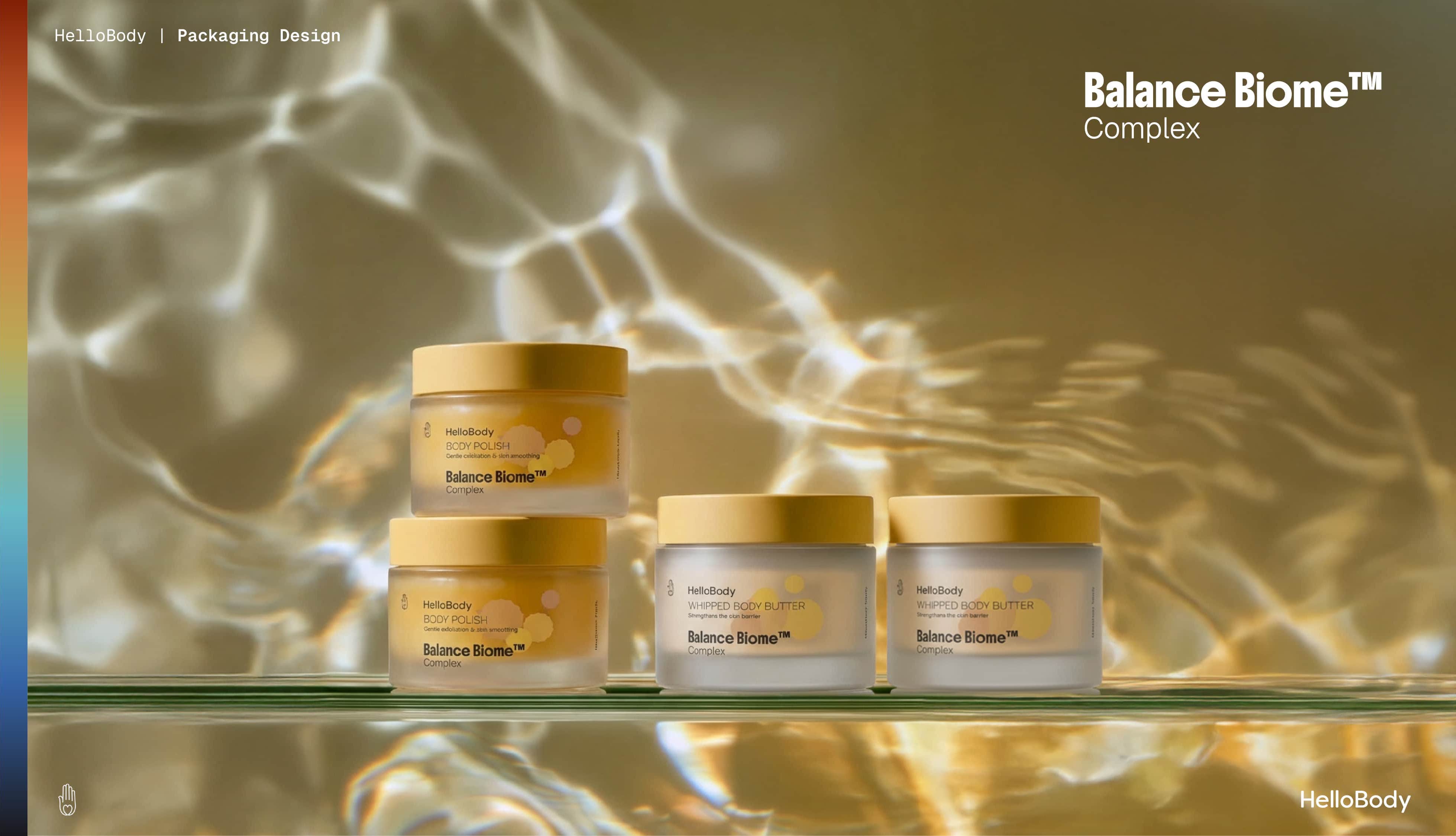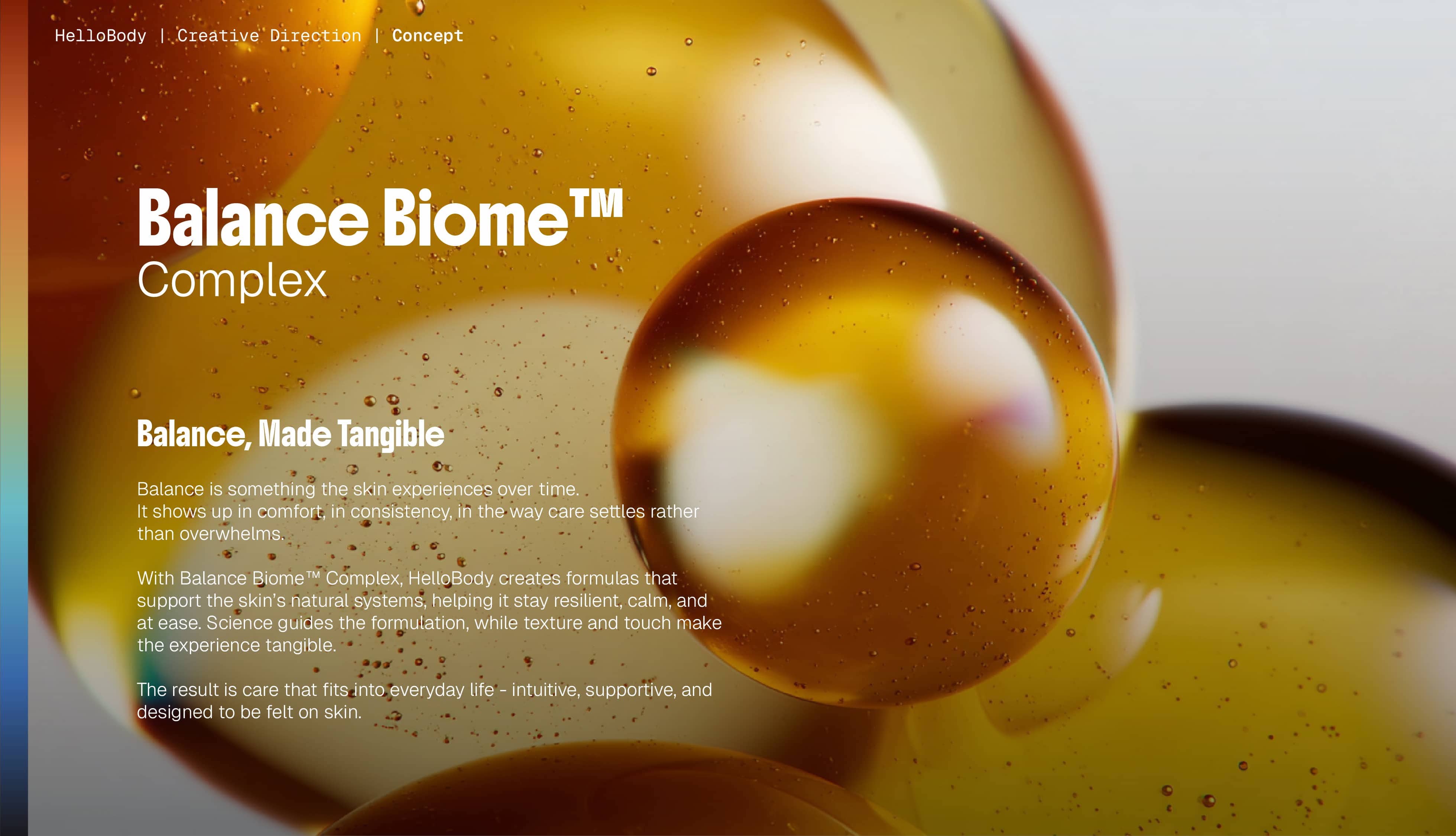 A holistic brand and product launch concept for HelloBody introducing Balance Biome™ Complex — a microbiome-supporting formula designed to strengthen the skin barrier while delivering everyday comfort. The project repositions science-led skincare through a lens of controlled softness, translating dermatological logic into a tactile, emotionally resonant brand experience.