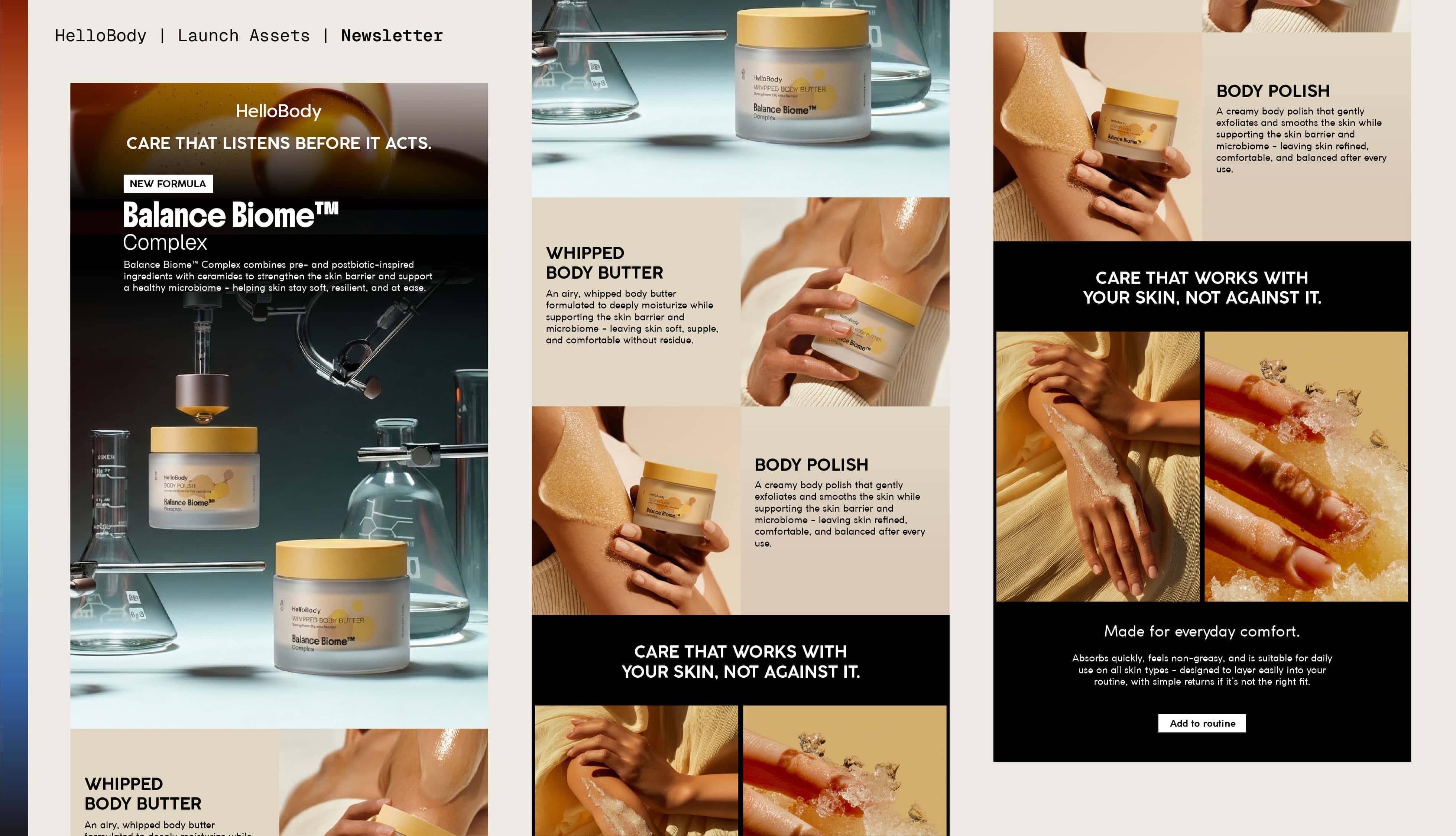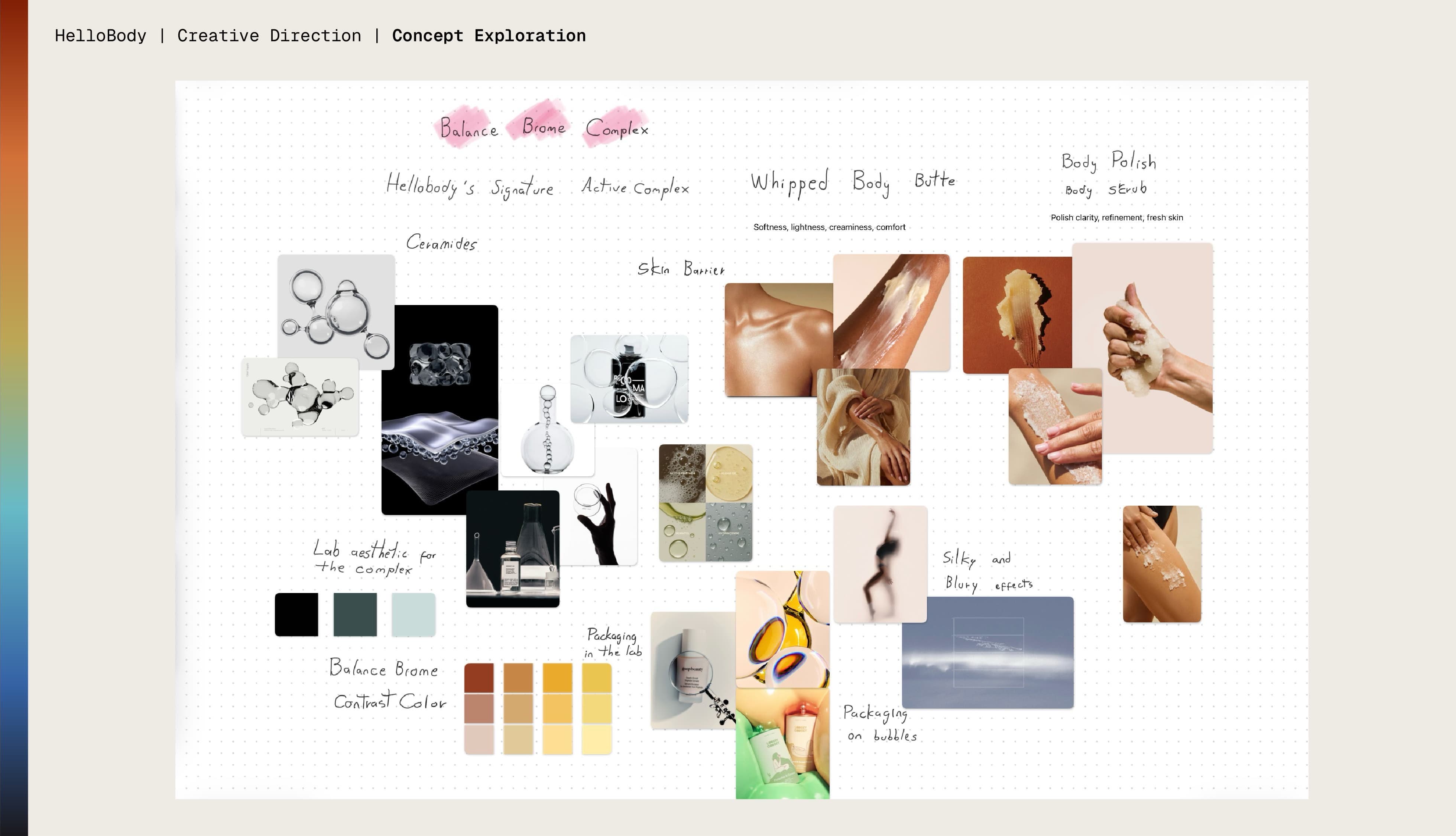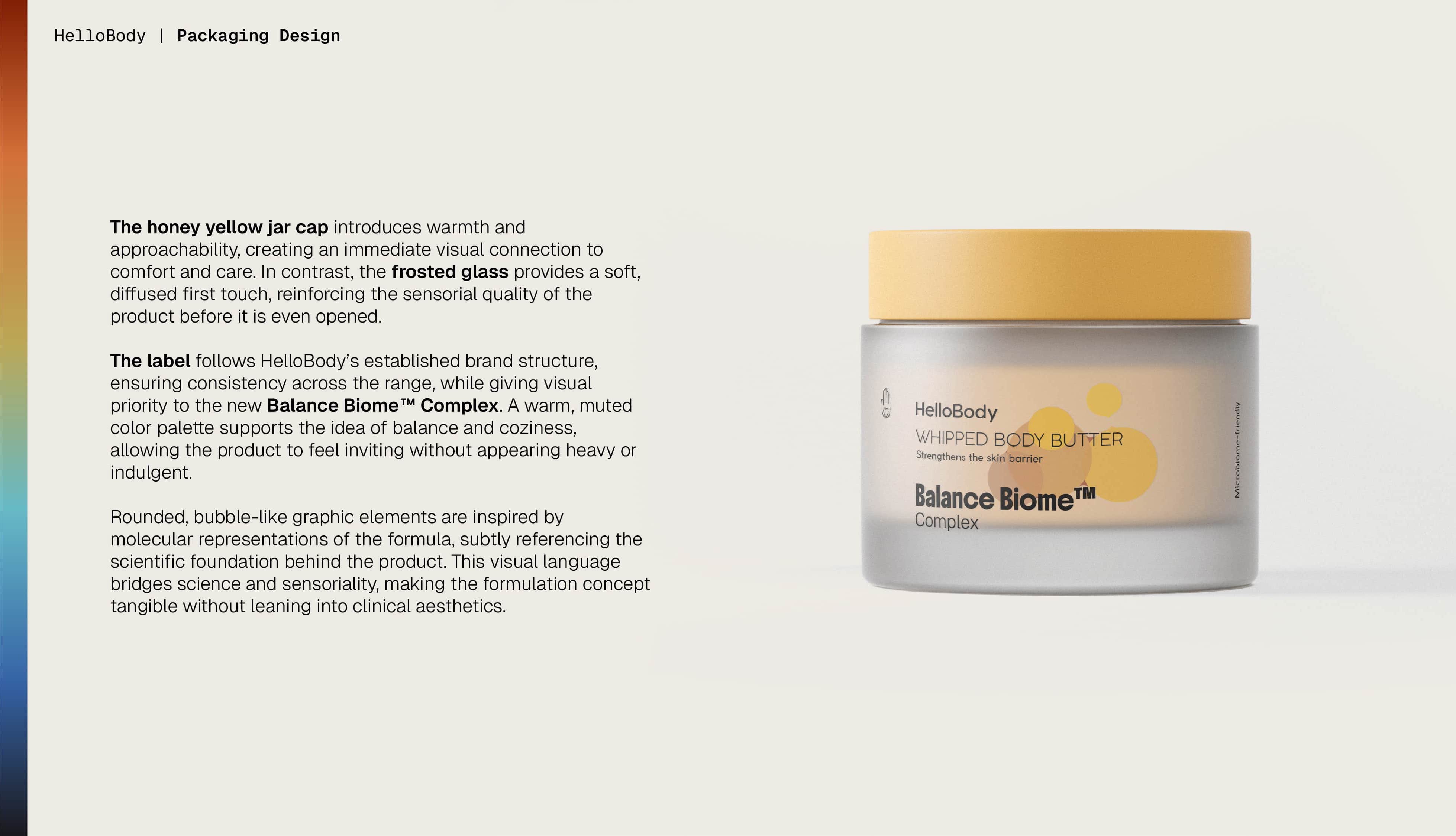 A holistic brand and product launch concept for HelloBody introducing Balance Biome™ Complex — a microbiome-supporting formula designed to strengthen the skin barrier while delivering everyday comfort. The project repositions science-led skincare through a lens of controlled softness, translating dermatological logic into a tactile, emotionally resonant brand experience.